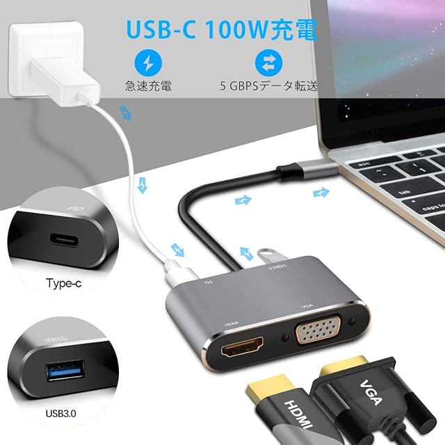 【USB C ハブ4in1】Type-CハブはHDMIポート+VGAポート+USB3.0ポート+USB-Cポートを備え、MacBook/ MacBook Pro/ChromeBook/Surface Go/Samsung /Huaweiなど<br>Type-Cポートを搭載するデバイスに最適なUSB Cハブです。この各種ポートを持つUSB C ハブはポート不足のデバイスにとって非常に有用である。<br><br>【usb type c HDMI vga 4k高解像度】このUSBタイプC HDMI VGA変換アダプターは、4K@(3840x2160P)30Hzの最大解像度に達し、PCの画面をより大きい画面で綺麗に表示出来ます。<br>映画や仕事で高品質の画面を楽しむのに役立ちます。これはHDMIとVGAを同時に出力できるドッキングステーション です。<br><br>【高速伝送とPD急速充電】usb type c ハブ は、データ同期と充電が可能です。5Gbpsまで高速データ伝送します。マウス、キーボード、リムーバブルハードドライブまたはほかのUSBデバイスに対応しています。<br>同時に、USB CアダプターをUSB C PDポートに接続して、PC(87W)に給電できます。<br><br>【USB-C HDMI VGA幅広い互換性】USB-Cハブ、プラグアンドプレイ。Switch/MacBook Pro/MacBook Air / Surface Go /iPad Pro /SAMSUNG /HUAMEI / HUAMEI MateなどのUSB-Cポート搭載のデバイスに最適です<br><br>VGAとHDMI 4K高画質解像度出力<br>4K出力対応のHDMIポートを搭載、大画面でもコンテンツをお楽しみいただけます。<br><br>VGAポートのみに接続する場合、画質解像度は最高で1080P @60Hzに達しています。<br><br>5Gbps USB3.0高速データ転送<br>USB3.0で5Gbps のデータ高速転送が可能です。高速USB3.0の転送速度はUSB2.0の約10倍(理論値)、HD映画もうただ一瞬で転送完了。<br><br>87W充電PD対応<br>USB C PDポートを接続して、パソコン本体へ電力供給が可能です。充電供給電力値87W(MAX)。<br><br>幅広い互換性<br>NOTEBOOK:<br><br>MacBook 12inch、 MacBook Pro2018、 MacBook Air、Huawei MateBook 、MateBook X、MateBookXPro<br><br>Honor Magic、<br><br>Xiaomi Air 12.5/13.3inch、Pro15.6inch、ゲームブック、<br><br>Asus U306、U321シリーズ、U4100 ROGシリーズ、Google Chromebook Pixels、PixelBook Pen、Razer、Microsoft Surface Book2、HP Pavilion x2、Elitebook Folio G1、Dell XPS13、XPS15、Lenovo Yoga5 Pro、ThinkPad<br><br>USB-Cポートを備えた設備など..<br><br>SMARTPHONES:<br><br>Samsung S8/S8+、S9/S9+、Note8、Note9..<br><br>Huawei mate 10、 mate 10Pro、mate 20、mate 20Pro、mate 20X、mate 30、mate 30Pro、P20/P20Pro、P30/P30Pro、