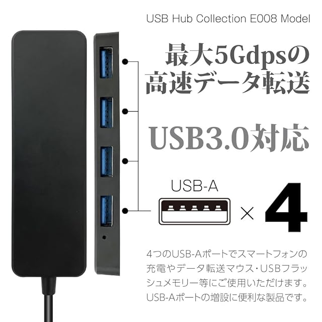 差し込み口:USB3.0対応 USB-A×4でスマートフォンの充電、データ転送、マウス、USBフラッシュメモリー等にご使用いただけます。