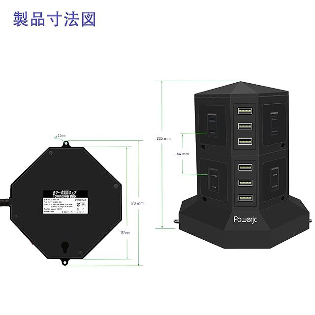 <b>Powerjcの製品仕様</b><br>材料:防火PC+ABS<br>定格周波数:50-60Hz<br>定格電流:10a<br>入力電圧:AC 95V-135V<br>AC 定格電力:1500W。<br>USB出力:DC 5V <br>USB:合計6A 最大2.4A<br>ケープル長さ:1.5m<br>防火ランク:94V0(最高)<br><b>。