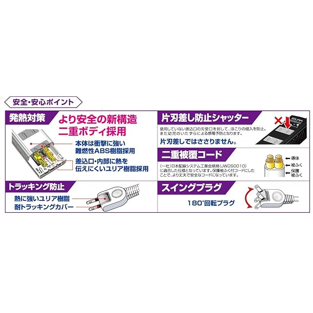 ●電源ラインサージ低減…内蔵されたサージ低減素子(バリスタ)が雷および開閉サージを低減し接続された機器を守ります。 ●耐雷サージ表示LED:耐雷サージ機能が作動中に点灯します。 ●強度に優れた台形フォルム ●滑り止め効果をもった握りやすいデザイン ●熱に強い二重ボディ構造 ●片刃差し防止シャッター ●耐トラッキングカバー付 ●180°回転スイングプラグ