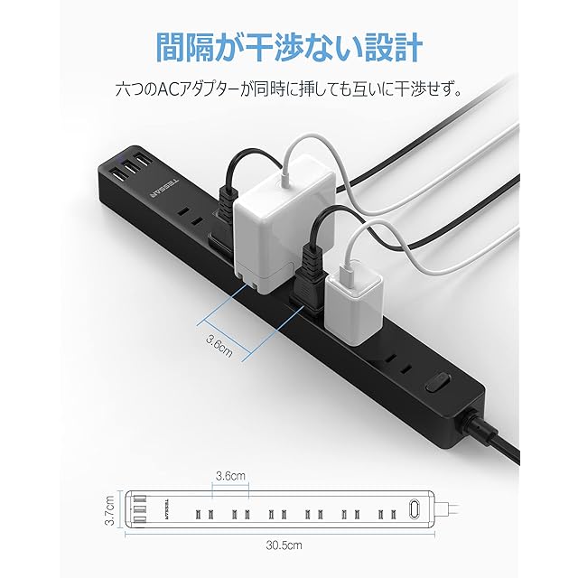 【コンパクト設計】本体サイズは305*37*27mm、長細いデザインで狭いスペースには最適です!ACコンセントは全部上面に設計されて、コードは絡まくことなく、スッキリ配線のデザインです。