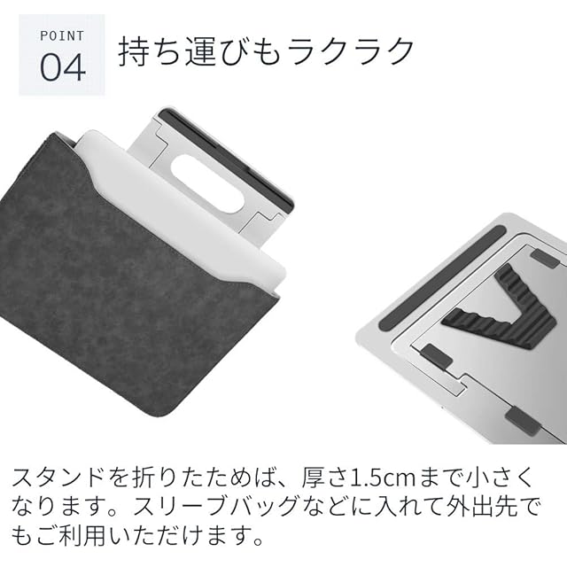 ✅ [ 折り畳み式 ] 角度調整用のフラップを折りたためば、たったの1.5cmまで薄くなります。薄型で収納スペースもとらないので使わないときは本棚などに立てかけておくことができます。 また、スリーブバッグと一緒に収納できるほどの薄さで、出先でも自宅と同じ環境がでご利用いただけます。 パソコン設置面には4箇所、本体背面にも4箇所に滑り止め用のシリコン製パッドを採用し、スタンドとしての安定感を強固にしています。