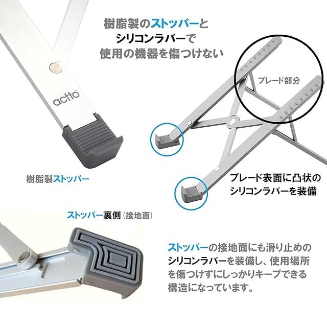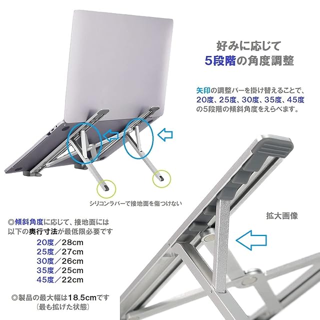 <製品の特徴>: <br /> ・アルミ合金製で軽量・スリムに折りたためる便利なノートPCスタンドです。保管や携帯に便利な上質ケース付きです。 <br /> ・左右への開き具合の調整で、6インチ程のタブレット~17インチの大画面ノートPCまで使用することができます(耐荷重:5Kg)。 <br /> ・傾斜角度を20度~45度までの5段階に調整できますので、PC作業時の姿勢改善に役立ちます。 <br /> ・他社品ではスキー板のような2本の細長い面で設置するタイプが多いですが、当品は接地部の前後が独立した4脚式の構造となっているため、少々前後に段差のある場所での使用(段差を跨いで)も可能です(但し、安定設置が前提条件となります)。 <br /> ・化粧箱入り(裏面に使用方法の写真有り)ですが、印刷文字はハングルです。<br /> ・材質:アルミニウム合金、ABS樹脂、シリコンラバー <br /> ・重量:224グラム(本体のみ) <br /> ・耐荷重:5キログラム