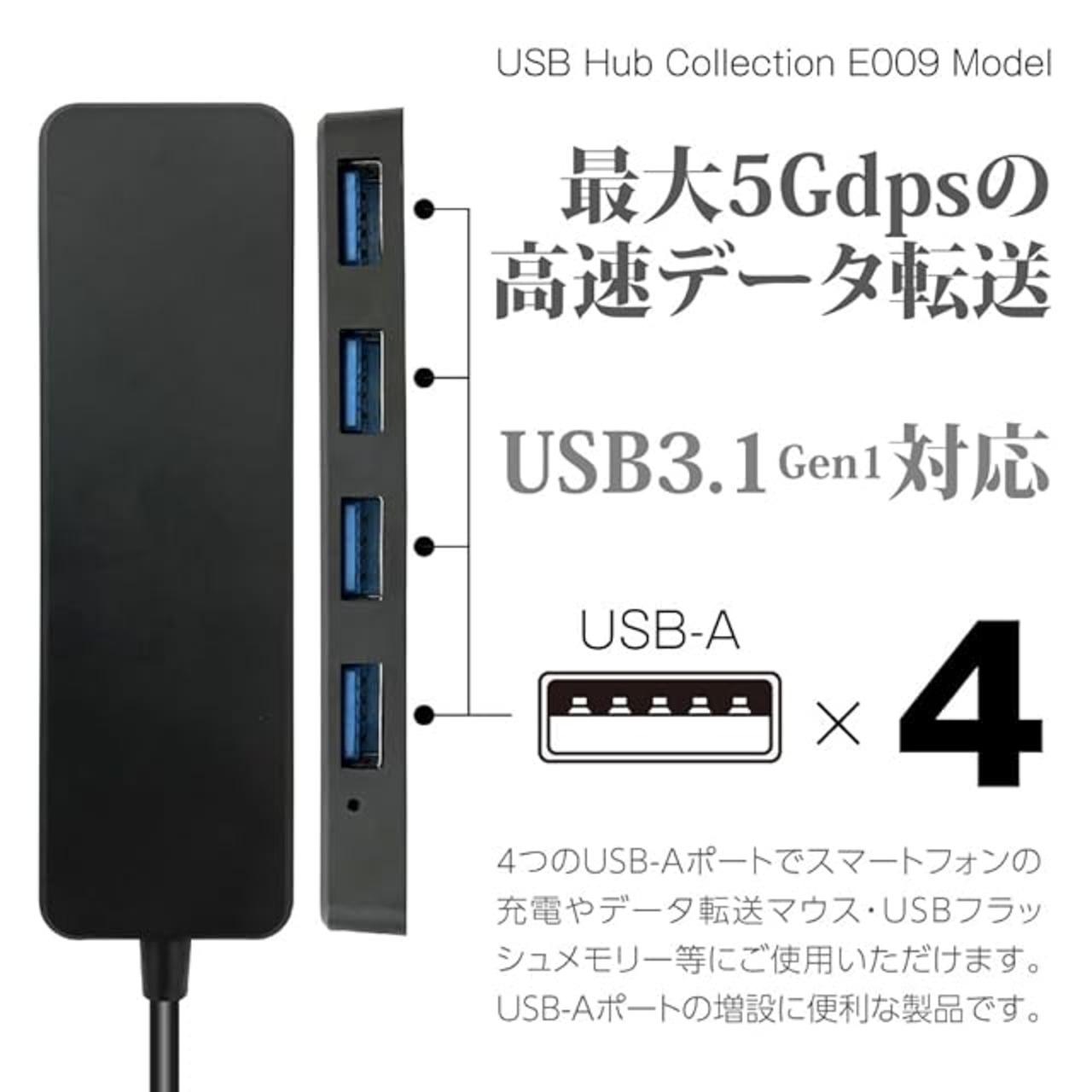 テレワークに最適なUSBハブ。タイプCコネクタ接続。USB3.1Gen1。タイプA×4ポート。 【製品スペック】 <本体> ■インターフェイス規格:USB仕様Ver3.1Gen1(USB3.0)準拠(USB Ver2.0/1.1上位互換) ■通信速度:5Gbps/480Mbps/12Mbps(理論値) ■コネクタ: ・USB3.1Gen1(USB3.0)Aコネクタ メス×4(ダウンストリーム) ・USB Type-Cコネクタ オス×1(アップストリーム) ■電源:バスパワー ■ケーブル長:約175mm ■外形寸法:約幅100×高さ10.5×奥行31mm(ケーブル部除く) ■本体質量:約30.1g <使用方法> ■本製品は、ドライバーをインストールする必要はありません。 パソコンに接続するだけで簡単にご使用いただけます。 ■本製品を使用する前に必ず、パソコン内のデータやメディア内のデータは 全てバックアップ作成をおこなってください。 ■本製品はすべてのパソコン、USB機器の動作を保証するものではありません。 <備考> ■仕様および外観は、性能改良のため予告なく変更することがあります。