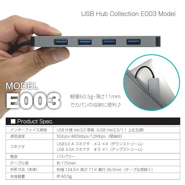 テレワークに最適なUSBハブ。タイプAコネクタ接続。USB3.0タイプA×4ポート。 【製品スペック】 <本体> ■インターフェイス規格:USB仕様Ver3.0準拠(USB Ver2.0/1.1上位互換) ■通信速度:5Gbps/480Mbps/12Mbps(理論値) ■コネクタ: ・USB3.0/Aコネクタ メス×4(ダウンストリーム) ・USB3.0/Aコネクタ オス×1(アップストリーム) ■電源:バスパワー ■ケーブル長:約175mm ■外形寸法:約幅124.5×高さ11×奥行36.5mm(ケーブル部除く) ■本体質量:約60.5g ■本体素材:アルミ製 <使用方法> ■本製品は、ドライバーをインストールする必要はありません。 パソコンに接続するだけで簡単にご使用いただけます。 ■本製品を使用する前に必ず、パソコン内のデータやメディア内のデータは 全てバックアップ作成をおこなってください。 ■本製品はすべてのパソコン、USB機器の動作を保証するものではありません。 <備考> ■仕様および外観は、性能改良のため予告なく変更することがあります。