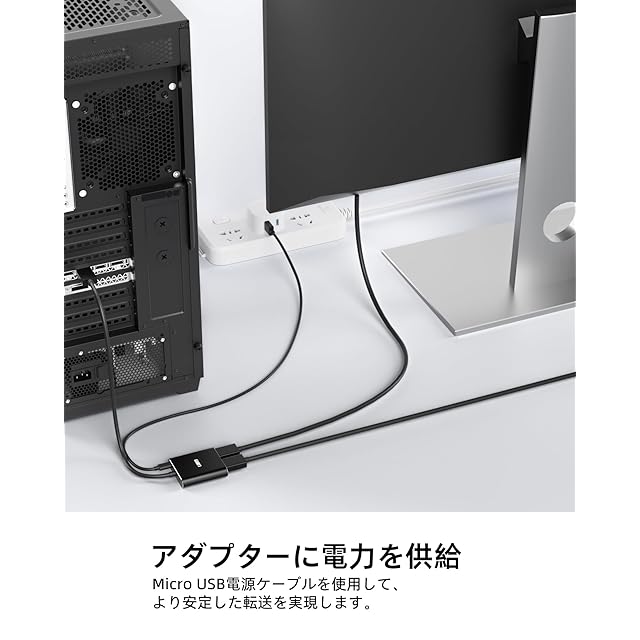 Micro USB:このDisplayPortデュアルモニターアダプターには、Micro USBケーブルが1本付属しています。*使用前に、マイクロUSB電源供給ケーブルをPCまたは電源アダプターのUSBポートに接続する必要があります。これは、ディスプレイポートハブが内蔵のチップセットに電力供給します。