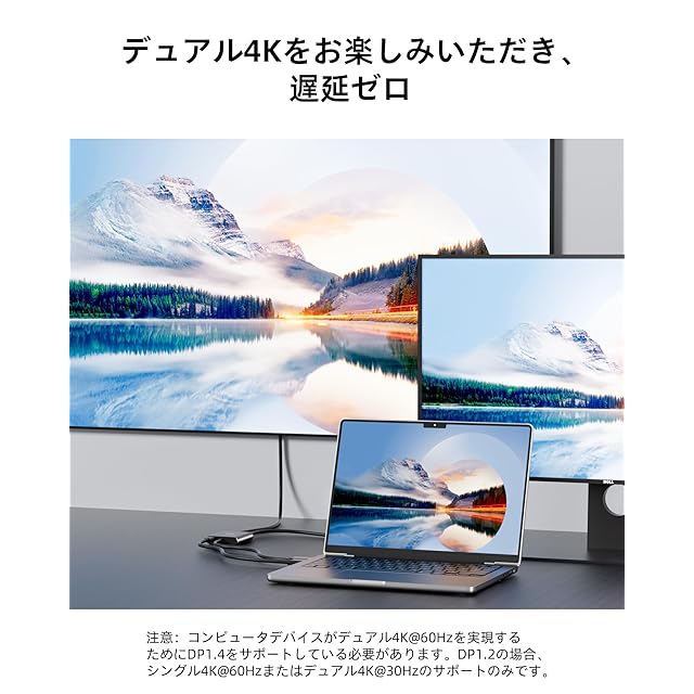 4K@60Hz UHD 高解像度:DisplayPort to デュアル DisplayPortスプリッター 分配器 アダプターの解像度は最大4K60Hzに対応しており、PC、ラップトップ、ノートパソコンなどのデバイスにデュアルディスプレイポートモニターを追加できます。学校、会議室、礼拝堂、小売店などでのマルチストリームディスプレイに最適で、超高精細のディスプレイコンテンツを提供します。 *デュアルディスプレイポートモニターの最大解像度4K@60Hzを達成するには、デュアルディスプレイポートモニターがDSCおよび4K 60Hzをサポートし、コンピューターのDP出力ポートがDP 1.4であることに注意してください。