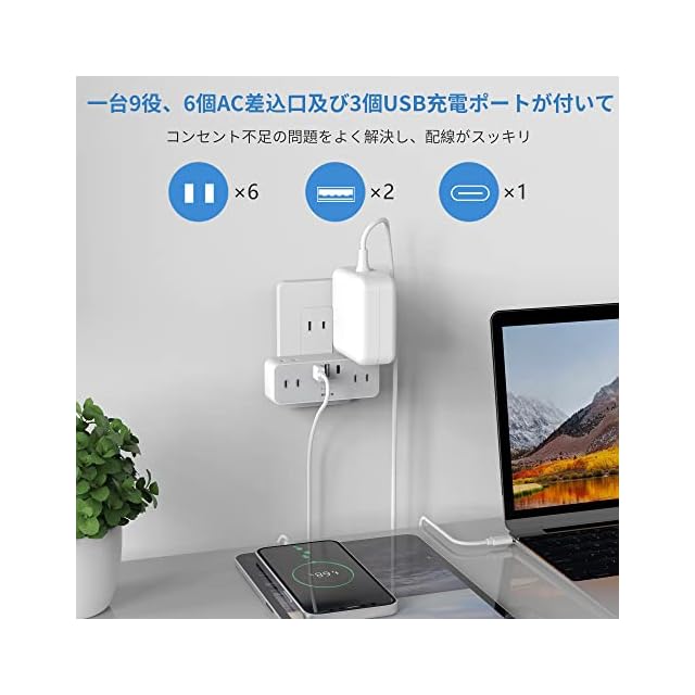 【1台多役コンセント タップ】1つのUSB-Cポート、2つのUSB-Aポートと6つのAC差込口を搭載したマルチタップです。色々な場所でのコンセントの増設に適用です。コンセント不足の問題を解決します。