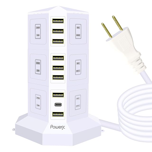 JIACHAN タワー式電源タップ3層縦コンセント 12ACスマート9USB USB C PD高速充電雷ガード 過負荷保護 省エオフィス/家庭PSE白