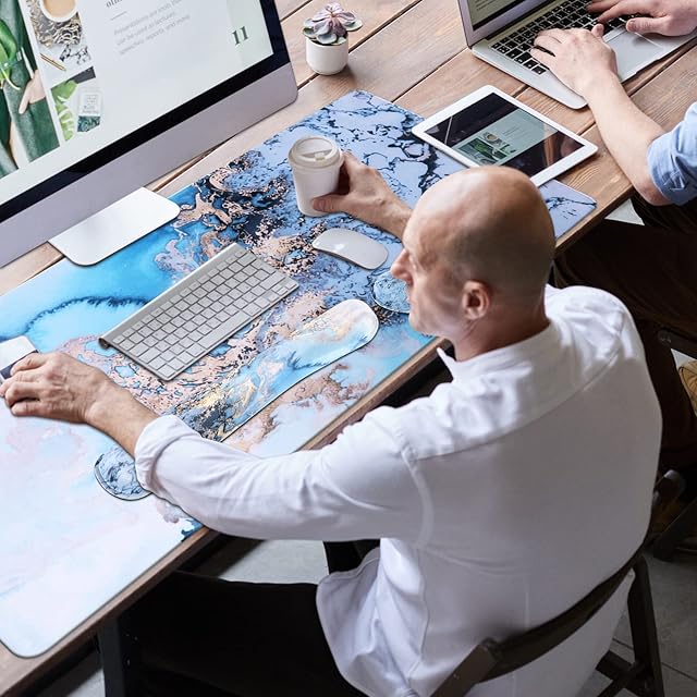 iCasso キーボードマウスパッドセット 拡張ゲーム用マウスパッド+キーボードリストレストサポート 低反発素材 簡単タイピング痛みの緩和 3枚(35.4×15.7インチ) 人間工学XXL 極厚デスクマット ブルーマーブル | AVENIR