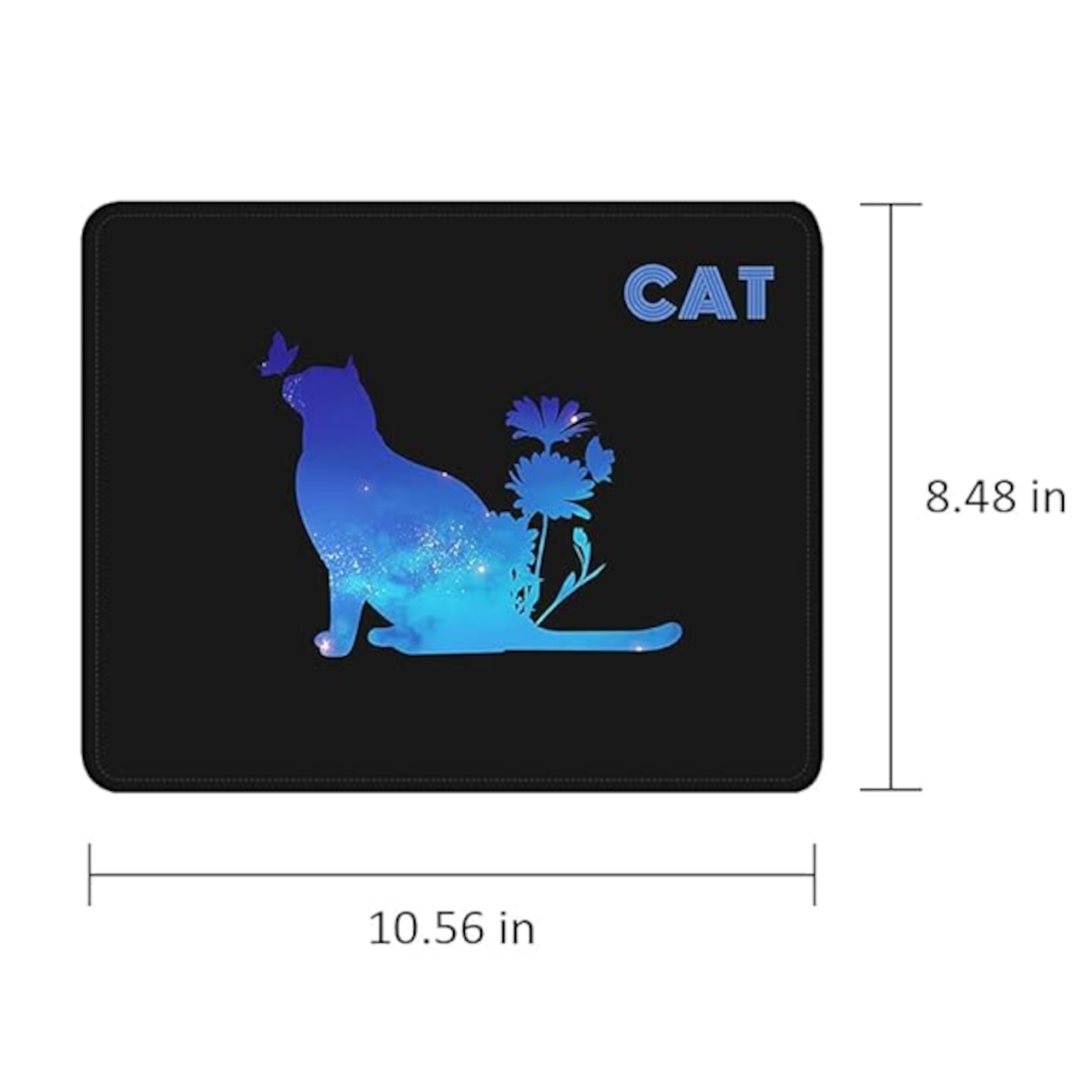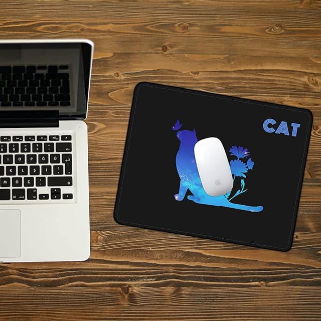 オリジナル猫柄デザイン: デスク環境に独自のスタイルと機能性をもたらす、クリエイティブなオリジナルデザインのマウスパッドです。庭で蝶と遊ぶ神秘的な猫のアートワークが、作業スペースに癒しとインスピレーションを提供します。