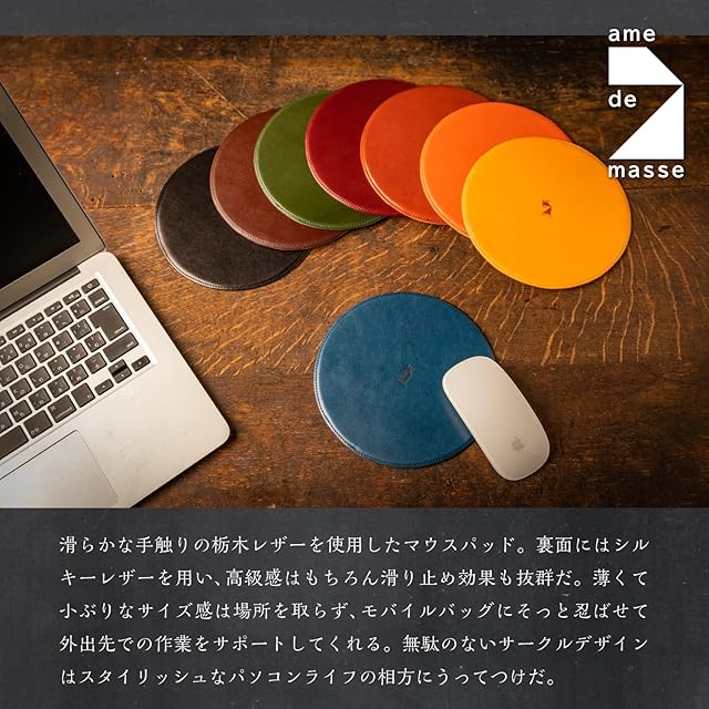 滑らかな手触りの栃木レザーを使用したマウスパッド。裏面にはシルキーレザーを用い、高級感はもちろん滑り止め効果も抜群だ。薄くて小ぶりなサイズ感は場所を取らず、モバイルバッグにそっと忍ばせて外出先での作業をサポートしてくれる。無駄のないサークルデザインはスタイリッシュなパソコンライフの相方にうってつけだ。