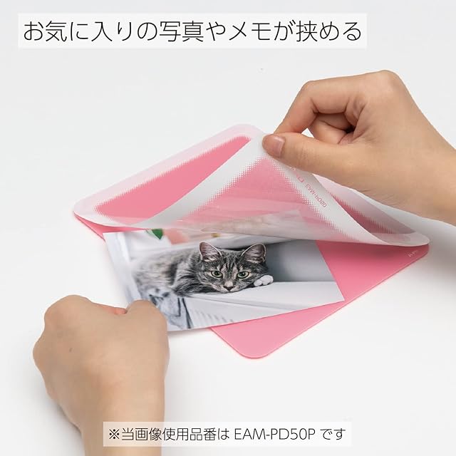 【特長】 お気に入りの写真などを挟めるマウスパッド。裏面にはショートカットキー入力ガイド付き。