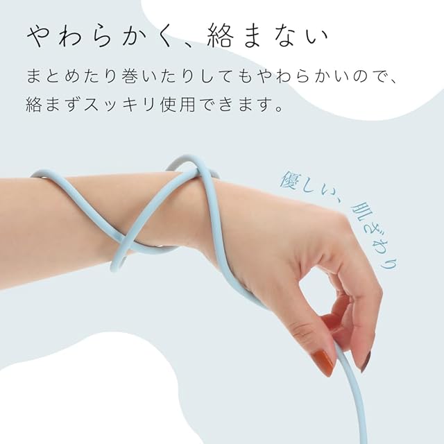 やわらかく、絡まりにくい:まとめたり巻いたりしてもやわらかいので、絡まずスッキリ使用できます。ケーブルがやわらかいから、くるっとまとめることでかばんやポーチなどに入れて持ち運びしやすい。