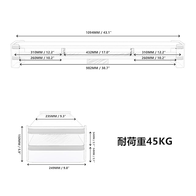 【商品仕様&12か月品質保証付き】モニター台のサイズ:1094*249*150MM,天板の厚さ15MM;脚: アクリル 本体重量:約6.8kg 最大耐荷重:45kg 組み立て式。保証期間内に、取り扱い説明書に準じた使用状態で故障や不具合が生じた場合は当社の判断により交換させていただきます。ご安心ください。