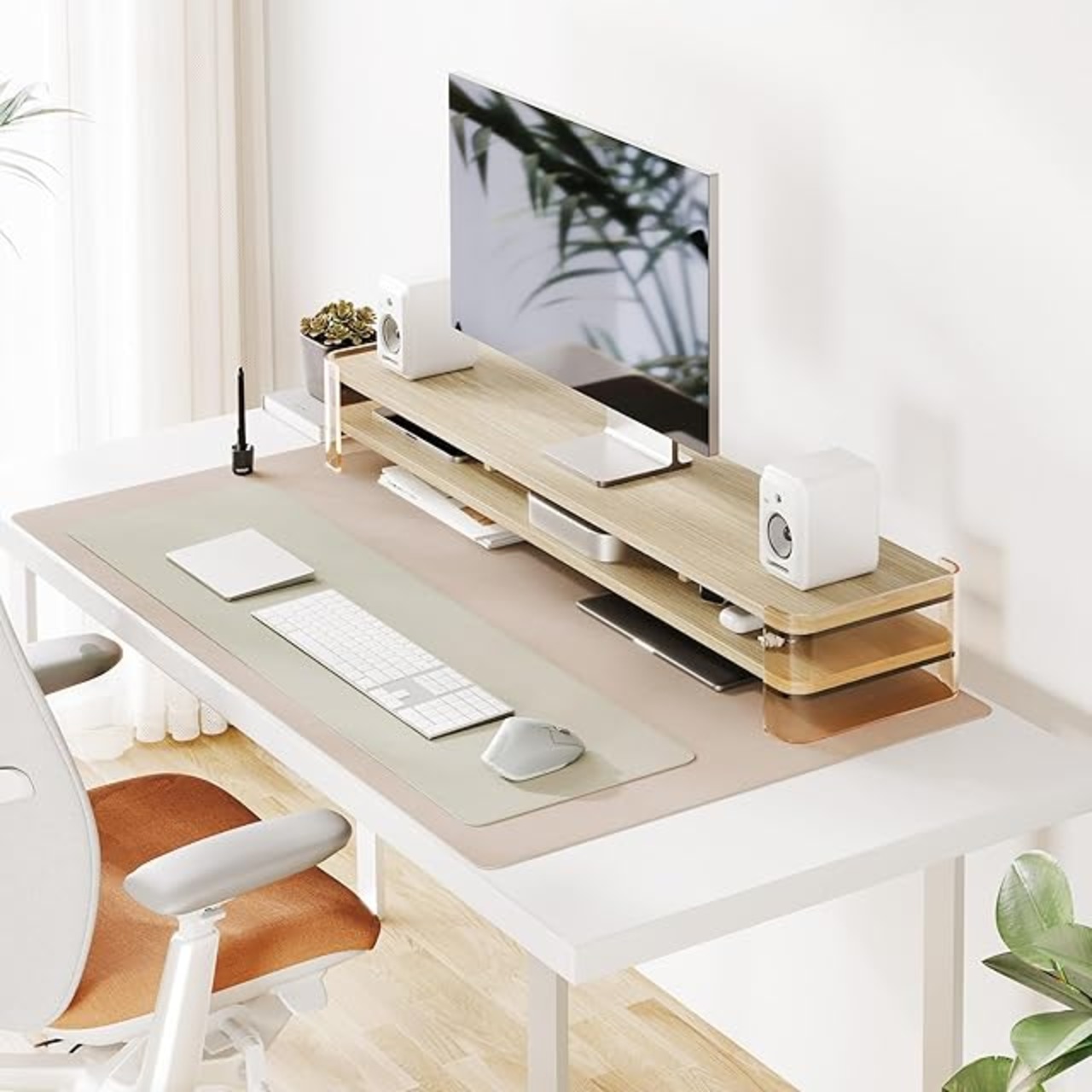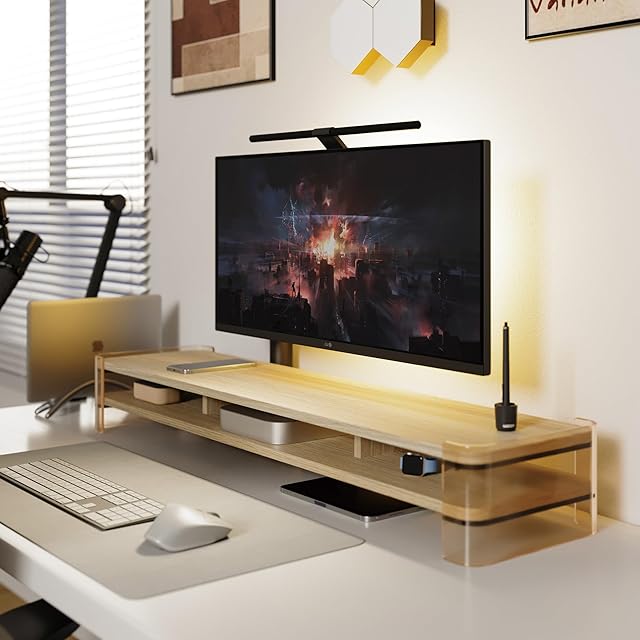 Fenge モニター台 モニタースタンド 卓上 机上台 パソコン台 PC台 机上ラック 110cm横幅 2段 木製天板 アクリル製脚 デスクトップ用 机上 モニタースタンド 机上台 pcモニター台 パソコンラック 卓上 収納 整理整頓 オークG04T2103C | AVENIR