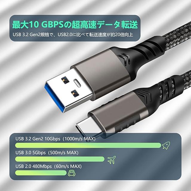 【10Gbps usb a cデータ転送ケーブル】本USB 3.2 Gen2 Type-C to Type-A変換ケーブルは、最大10Gbps高速データ転送をサーポートします。USB C SSD のHD映画、または音楽をわずか何秒で転送できます(ご注意:本USBケーブルはビデオ出力は非対応です)。