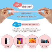 【断線に強い】硬くて丈夫でも不便なら意味がない。柔軟性と耐久性を両立した便利なケーブルです。取り回し自由な柔らかさと360度湾曲試験を30,000回クリアした"強さ"お試しください。【PD/QC対応 , 3A急速充電】最大3Aの速くてパワフルなケーブルです。PD/QC対応なので、高速充電対応の充電器・端末のパフォーマンスを活用することができます。
