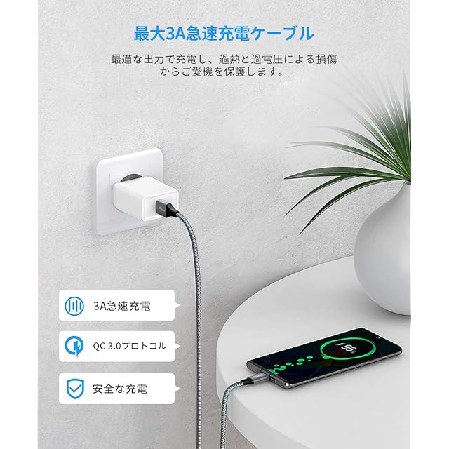 【急速充電とデーター同期】このたいぷcケーブルは最大3A電流(Quick charge 3.0対応)の出力により、安定してフルスピードで充電をご提供しております。また、USB 2.0基準、高速データ転送(最大480Mb/s)が可能でき、映画、ファイル、曲などを素早く転送し、お客様の貴重な時間が大幅に節約できます。