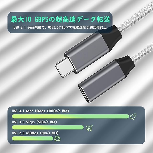 【USB type C 延長ケーブル】USB 3.2Gen 2規格延長ケーブルは、Type Cデバイス(Type Cポートを備えているスマートフォンやパソコンなど)間の接続ケーブルを延長し、充電やデータ同期を実現することができます。