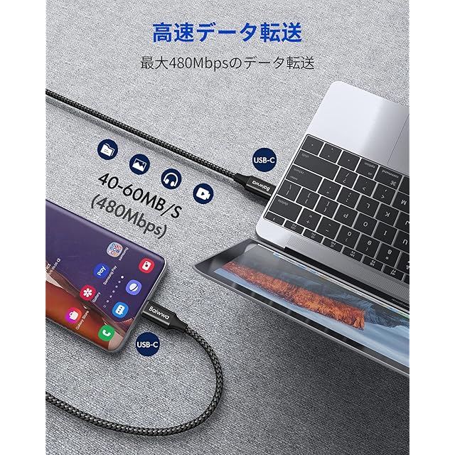 【最大60WのPD対応急速充電】このtype-c pd ケーブルはUSB PD(Power-Delivery)対応にし、最大60Wまで電力を供給可能、充電時間を大幅に短縮できます。USB2.0基準で最大伝送速度480 Mbps実現がが可能です。(*注:この製品はビデオ出力をサポートしていません。)