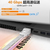 高速光通信ケーブル:次世代40ギガビットイーサネットの「40GBASE-T」に対応カテゴリ8対応のフラットLANケーブル、伝送帯域は2000MHzで、カテゴリ6の8.0倍、カテゴリ7の3.3倍。帯域が広いほど高速伝送が可能になり、データエラー防止に効果があります。安定した高速通信や速度アップを求める方に!