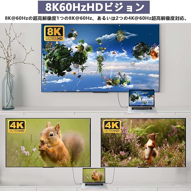 【8K@60Hz超高解像度】USB CポートのパソコンやスマホからUSB Type Cを搭載したモニター、ディスプレイに接続すると、1つの8K(7680*4320)@60Hz、あるいは2つの4K(3840*2160)@60Hzの超高解像度が対応でき、鮮やかな画面が表示できます。