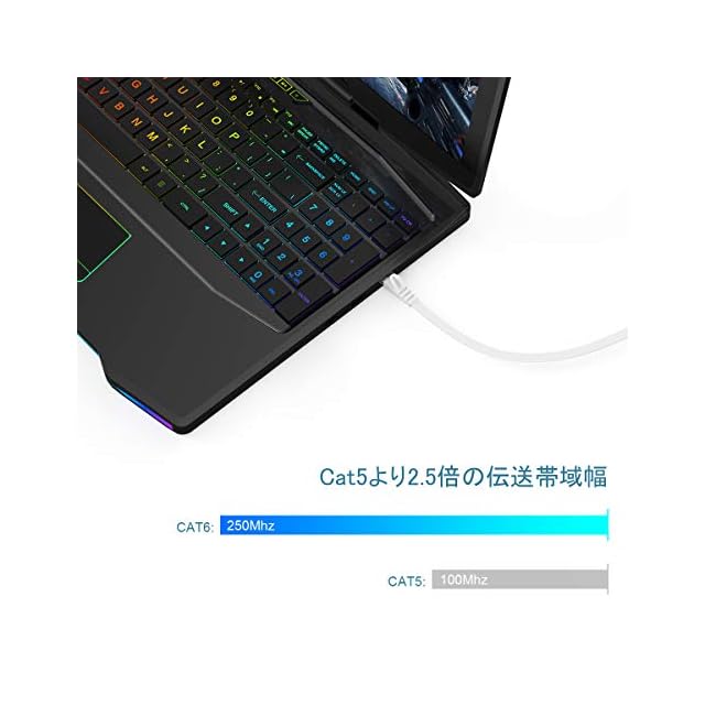 [CAT5より2.5倍の通信速度]:CAT6 LANケーブルはCAT5よりもっと高い帯域幅を持って、CAT5の2.5倍、250MHz伝送帯域幅に達します。高い帯域幅を持って、伝送速度は1000Mbps(1Gbps)、通信速度は速くなり、データを高速伝送します。1.0Gbps/250MHzの標準に達っします。10GBASE-T、100BASE-T、1000BASE-TX、100BASE-TX、10BASE-Tに適用します。10Gbpsギガビットのイーサネット環境に対応します。