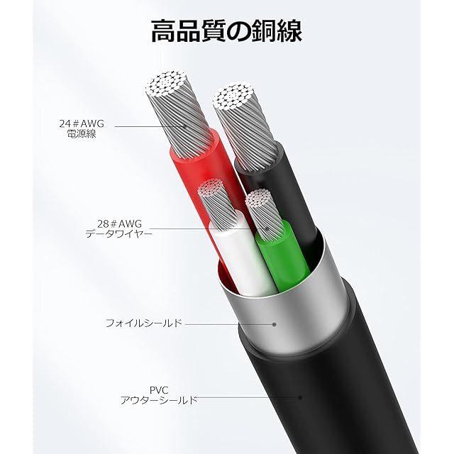 【急速充電】24AWG銅線コアとUSB2.0(480Mbps)で3Aの電流急速充電をサポートPCでのデータ転送