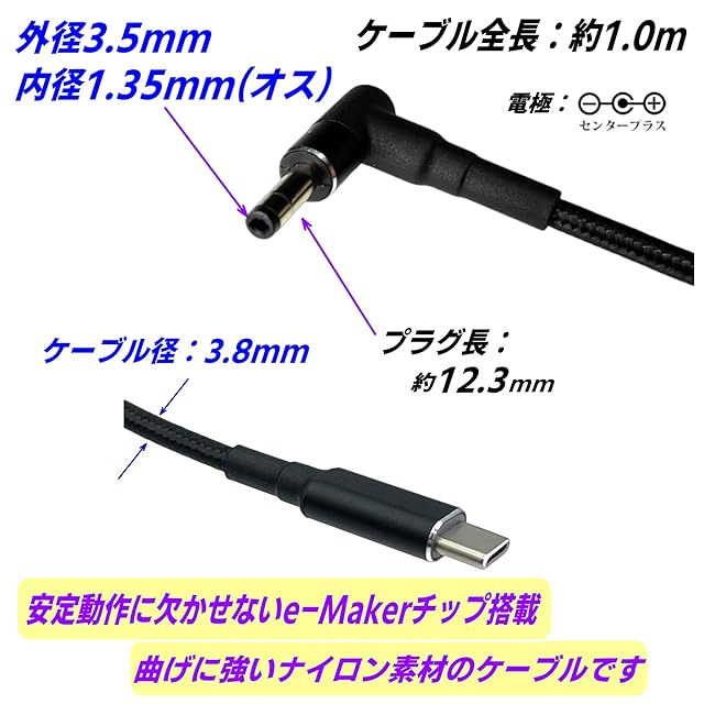 CNCTWO(コネクトツー) PDケーブル 富士通タブレットARROWSなど USB TypeC(オス)→DC L字型プラグ 100W出力 PD急速充電ケーブル 丈夫なナイロン素材 重いACアダプタの代用 エミュレーター トリガー(3.5*1.35mm) | AVENIR