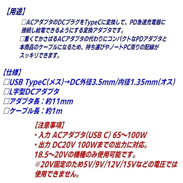 【用途・特徴】 ■ACアダプタをTypeCに変換して、急速充電器(PD対応)に接続し給電する変換ケーブル ■重くてかさばるACアダプタの代わりにコンパクトなPDアダプタとこのケーブルになり、持ち運びやノートPC周りの配線がスッキリできます