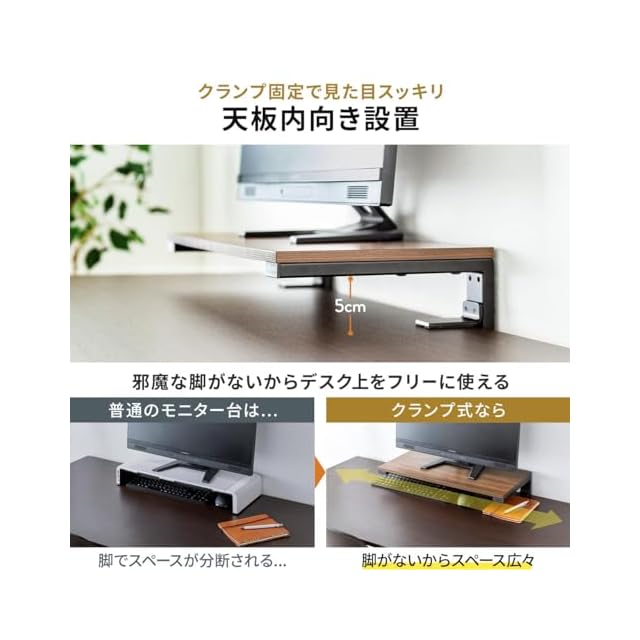クランプ固定 (内向き、外向き)、 卓上 に 直置き と3WAYで使える モニタースタンド です。
