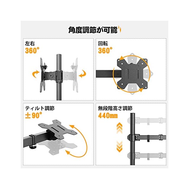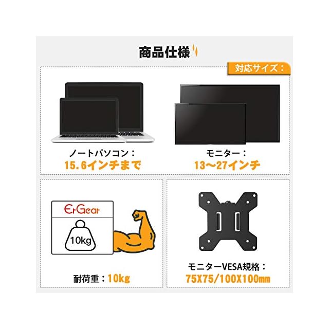 【ノートパソコン&モニター両用式】15.6インチまで、重量が10kg以内のノートパソコンに対応します。◆ノートパソコントレイを外して、モニターアームとしても使用できます。VESA規格が75x75mmまたは100x100mm、サイズが13-27インチ、重量10kg以内のモニター・ディスプレイに対応します。