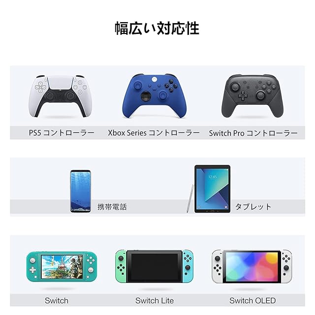 対応機種:PS5 コントローラー、Switch本体、Switchコントローラー、Xbox Seriesコントローラー対応。それ以外、USB Type-Cのスマートフォンやタブレットにも充電・データ転送対応できる多用途ケーブルです。