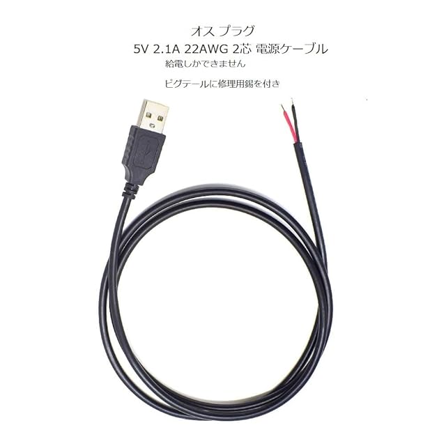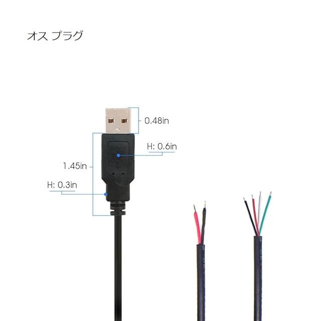 製品説明<br/><br/> ※仕様:USB Aオスプラグ~裸線オープンエンドケーブル<br/> ※外装素材:PVC<br/> ※線材:裸銅線<br/> ※線種:2芯、4芯<br/> ※コアの定義: 赤線: 正電源 (配線上にマーク: +5V または VCC)<br/> 白線: - データライン (として識別: データまたは USB ポート -)<br/> 緑の線: + データ線 (次のように識別: Data+ または USB ポート +)<br/> 黒線: アース (識別: GROUND)<br/> ※長さ:3.3FT(100cm)<br/> ※カラー:ブラック<br/> ※用途:主に携帯電話の充電やデータ伝送線、小型扇風機、小型家電のライトストリップ、電源アダプター、USBソケットボード、回路基板、各種小型電化製品の保守・拡張に使用<br/> ※パッケージ:オスプラグ2個入り(1パック2芯&1パック4芯)<br/>