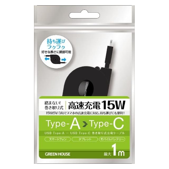 グリーンハウス(Green House) USB Type-C ケーブル 巻き取りタイプ 1m 最大出力1m 15w 充電 充電ケーブル データ転送ケーブル GH-UMCA15-BK