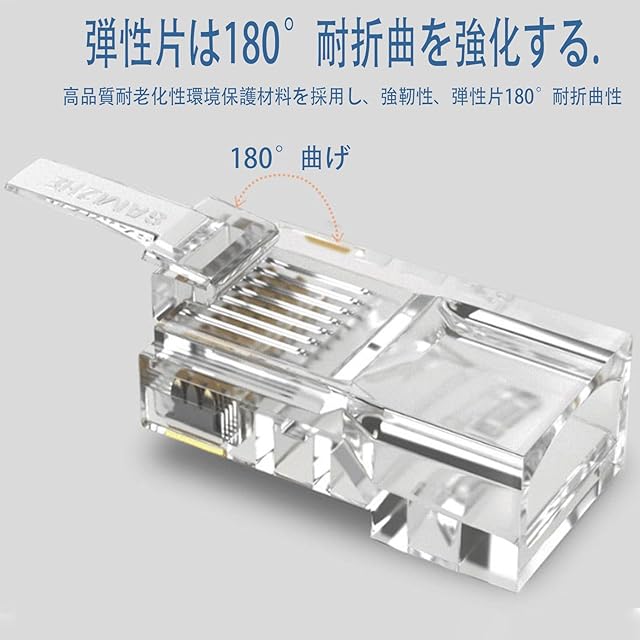【 lanコネクタ】LANケーブルに使われる8極8芯(8P8C)のRJ-45コネクタ(モジュラプラグ)です。カテゴリ6 (CAT6a )に準拠し、単線ケーブル及びヨリ線ケーブルの両方に対応しています。23〜26 AWG丸いネットワークケーブル及びフラットネットワークケーブルに適用しております。<br><br><br>【金メッキ三叉ブレード】金メッキピンを採用しておりますので、信号の減衰に強い、速くて安定的なシングル伝送を提供できる、ギガビットイーサネット定格のネットワークに信頼性の高いパフォーマンスを提供します。8P8Cネットワークコネクタの金メッキ接点は、Cat6ケーブルに優れた伝送性能と耐腐食性を提供します。<br><br><br>【カテゴリ6の規格】LANコネクタがギガビットイーサネットチャネルに準拠したネットワークのカテゴリ6のパフォーマンスを持ちます。Cat 5eより線または単線ケーブルとの下位互換性があります。<br><br><br>【エコ素材採用】PC素材を採用したエコ製品。色は透明で、透明な製品は線の順序を識別するのに役立ち、インジケータライトの透明度を高めます。<br><br><br>【弾片耐曲げ】水晶頭弾片は強化処理を経て、より耐曲げ、180°曲げ試験を経て、弾片は20回以上曲げて断裂しない。<br><br><br>