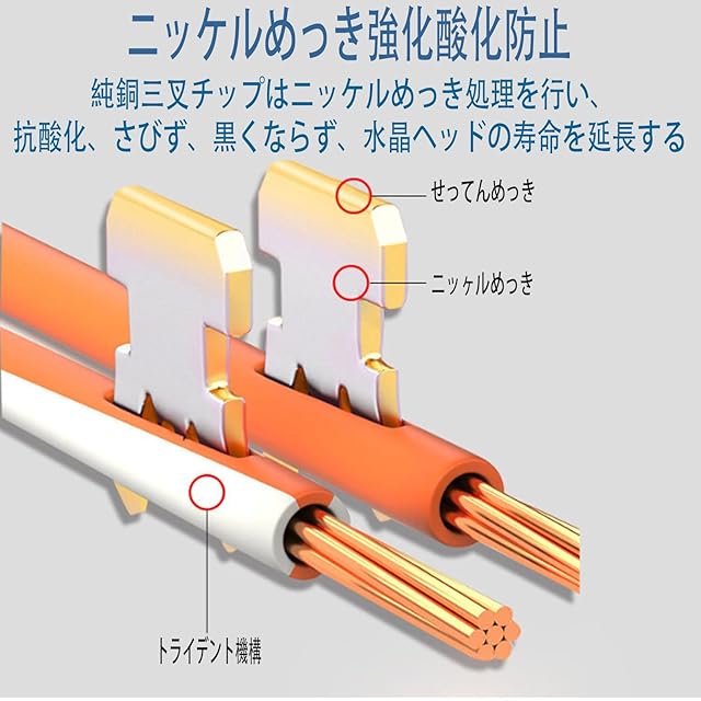 【金メッキ三叉ブレード】金メッキピンを採用しておりますので、信号の減衰に強い、速くて安定的なシングル伝送を提供できる、ギガビットイーサネット定格のネットワークに信頼性の高いパフォーマンスを提供します。8P8Cネットワークコネクタの金メッキ接点は、Cat6ケーブルに優れた伝送性能と耐腐食性を提供します。