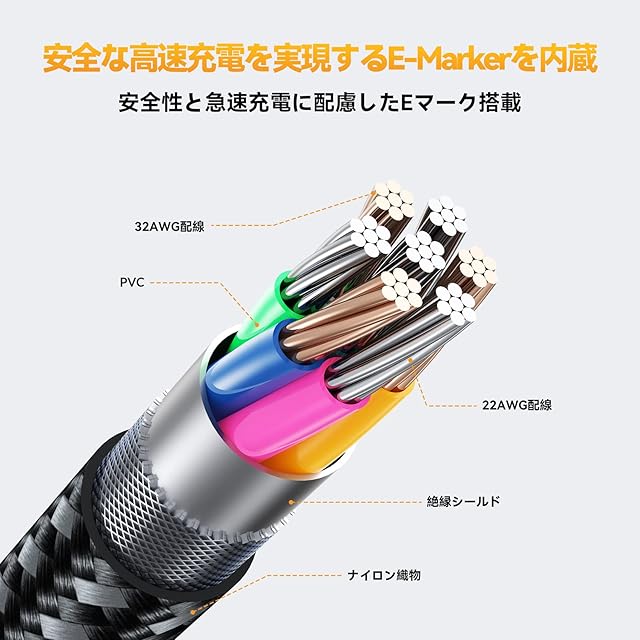 【優れた耐久性】ナイロン編組USB-Cケーブルは、90度曲げ試験の20000+サイクルに耐え、ストレインリリーフデザインと固体アルミニウムシールドは、ケーブルに長いサービス寿命を提供し、決して破裂することはありません。100W超高速充電USB Cケーブルは最高の電力供給E-Markチップで構築されており、USB PD高速充電をサポートし、デバイスのバッテリーとアダプタに包括的な保護を提供し、光速充電と安全性を維持することができます。