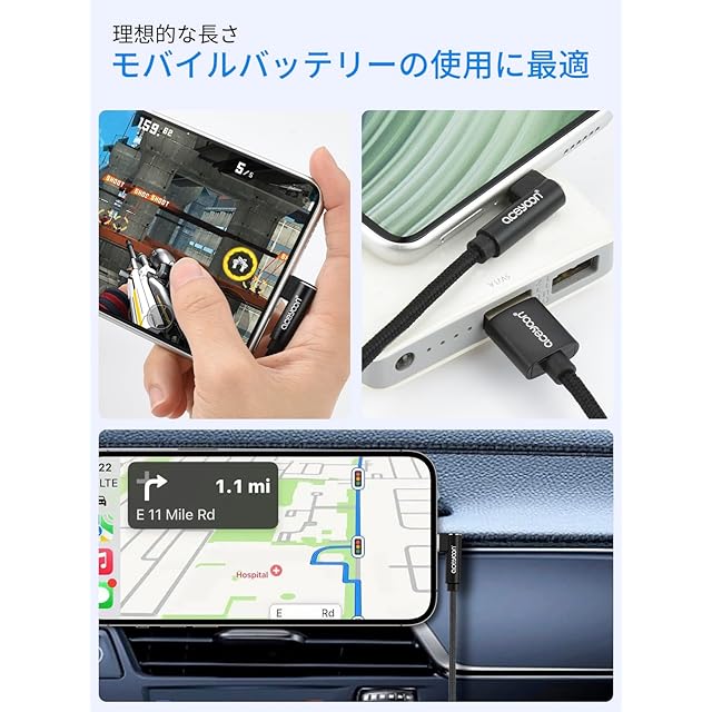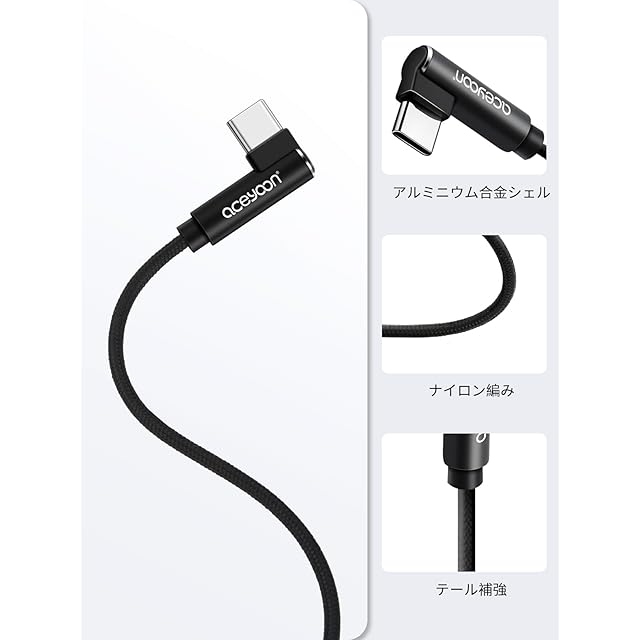 【L字型コネクターデザイン】コネクタがL型デザインのUSB Type c L字ケーブルは充電しながらゲームをしたり、動画を見たりする際に、邪魔にならず、快適に楽しめます。また、使用中ケーブルの折り曲げを減少し、インターフェイスを保護します。 コネクタの根元に余計な負荷をかけず、使用寿命も延長できます。