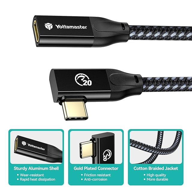 Yottamaster USB Type-C 延長ケーブル(1m、L字型) 100W PD急速充電対応 20Gbps高速データ転送 4K@60Hz映像出力 USB3.2 Gen2x2 メス→オス変換 タイプc延長ケーブル対応 超高耐久 ブラック[P-U100-CYC20-2] | AVENIR
