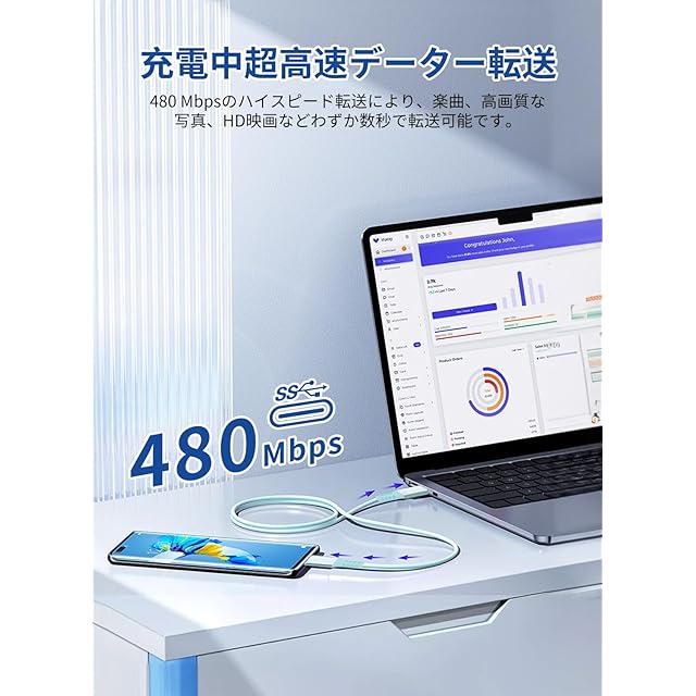 【60W/3A 急速充電対応・高速データ転送】このUSB-C to USB-Cケーブルは、最大60Wの急速充電に対応し、スマートフォンやタブレット、PCの充電時間を大幅に短縮します。最大480Mbpsのデータ転送速度で、充電とデータ転送を同時に実現します。