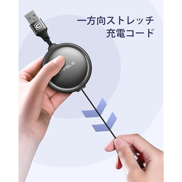 【一方向巻き取り式&片手操作】一方向巻き取り式の設計を採用して、リール部分は動かず固定されます。リール内に1本だけのケーブルが収納され、片手で操作可能、引っかかるや絡む等の心配はありません、スムーズに使えます。また充電器やモバイルバッテリーに挿したままでも快適にケーブルを伸びます。日常の充電時より便利になります。子供や老人でも簡単に使用可能です。巻き取り式ケーブルは30cmから105cmまで3段階の長さを自由に調節でき、伸縮自由に簡単に収納でき、普段外出、旅行、オフィス、車内、出張などに携帯用は大変便利です!