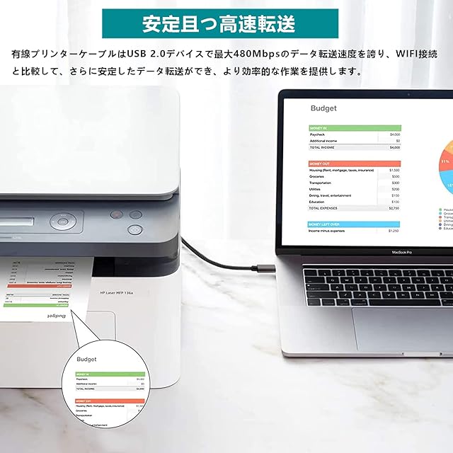 使い方は簡単:ドライバー不要、プリンターに接続だけで使用可能なUSB2.0 Type Bケーブルです。プリンターとパソコンに接続し、すべてのファイルと写真をはっきりと印刷し、歪まないようにできます。ご注意:ご購入の前に、お使いのデバイスはUSB 3.0 Type Bではなく、USB2.0 Type Bのインターフェースを予めご確認ください。