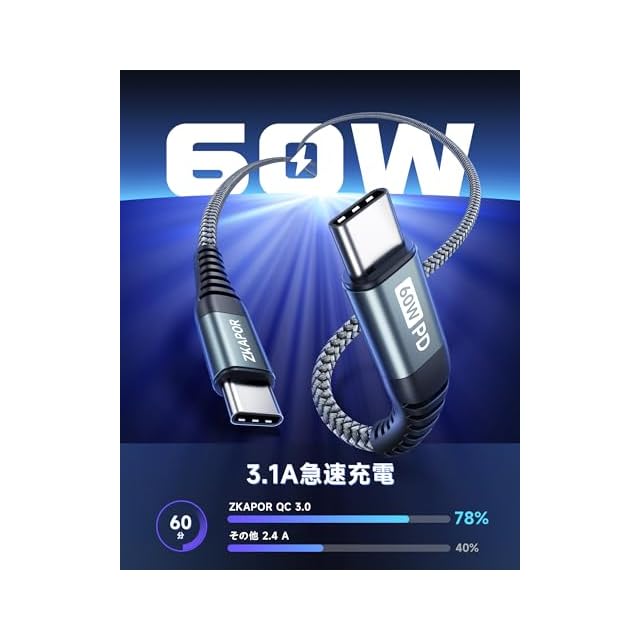 【60W急速充電&データ転送】ZKAPOR タイプc ケーブル 急速充電はPD 2.0とQC 3.0の急速充電をサポートし、最大60W(20V/3A)の急速充電と最大480Mbpsのデータ転送を提供します。 0から50%の電力まで30分しかかかりません。充電とデータ転送の時間を大幅に節約できます。★映像出力には非対応です。
