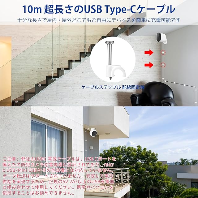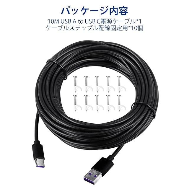 パッケージ内容:USB A to USB C 充電ケーブル*1本 (10M),ケーブルステップル配線固定用*10個。(ご注意:1.防犯カメラ給電・充電専用のUSB TypeCケーブルです。電源供給にのみ適用可能であり、データ伝送をサポートしていません。micro USB/Mini USBのインターフェース設備には対応していません。2.最大電流は 5V 2A です。急速充電機能なし、ただカメラ給電用。他のデバイスを充電することに使用できません。使用中に携帯やコンピュータ/ノートパソコンを接続しないでください。3.安定した電力供給を実現しいなら、正規の5V 2A(10W)/以上のUSB充電器と組み合わせて使用してください。 パソコン等の機器に接続すると動作しない場合があります。)