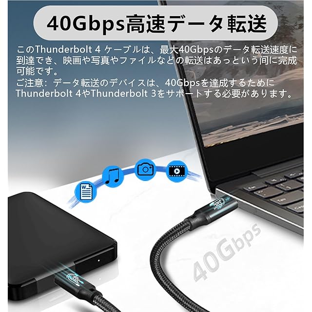 【40Gbps高速データ転送】このThunderbolt 4 ケーブルは、最大40Gbpsのデータ転送速度に到達でき、映画や写真やファイルなどの転送はあっという间に完成可能です。(ご注意:データ転送のデバイスは、40Gbpsを達成するためにThunderbolt 4やThunderbolt 3をサポートする必要があります。)
