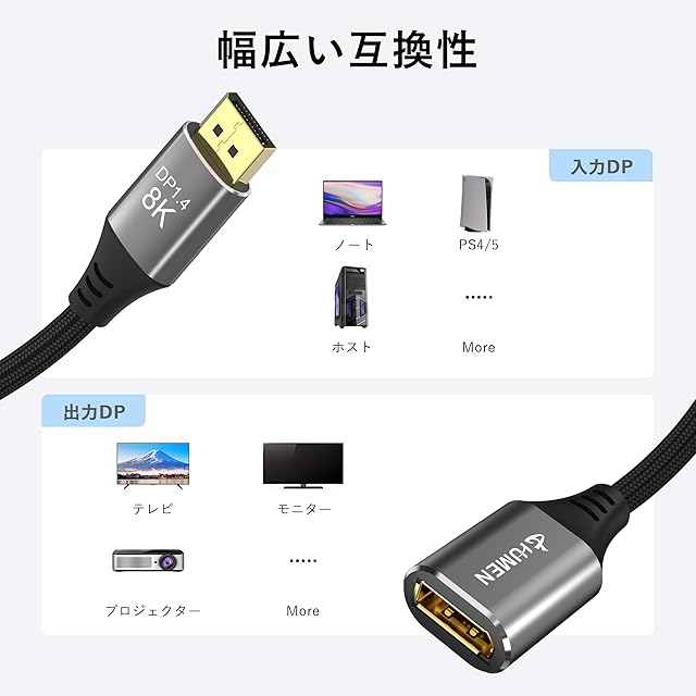 【8K DisplayPort 延長ケーブル】8K ディスプレイポート 延長ケーブルはDP 1.4規格で、ダイナミックHDRとeARCをサポートしています。デバイスの既存のDisplayPort ケーブルを延長して、ケーブルの長さが足りない問題を解決することができ、DPデバイスを簡単に接続することができます。頻繁に接続する必要がある場合は、グラフィックカードやディスプレイポートの摩耗を減らすために弊店のDP延長ケーブルを使用するのは良い選択です。DisplayPort 1.3/1.2/1.1a/1.1 規格との後方互換性があります。