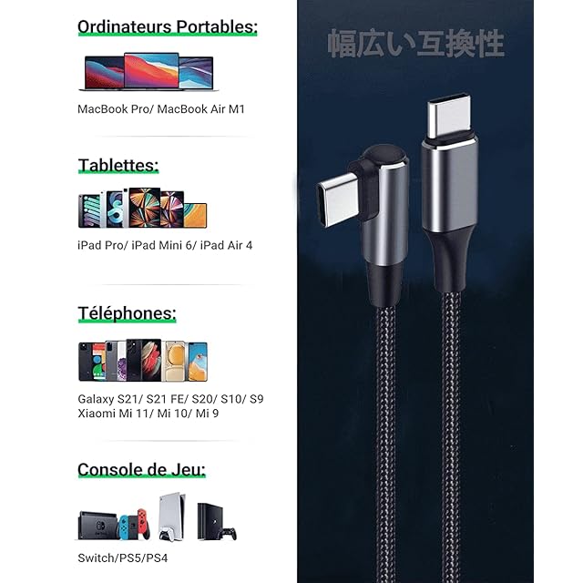 【最大100Wの超高速充電対応】USB PD(Power-Delivery)対応により、最大100W (20V×5A)まで安全かつ安定して出力できます。スマホだけでなく、各種タブレット、PCなどの充電時間を大幅に短縮できます。L字なので、ケーブルの取り回しが非常に楽です。また、過度に曲げることで断線や脱線を防ぎます。(▲ご注意:充電器と接続する機器がPD対応している場合に限ります。)100W 87W 61W 45W 30W 18Wの電力供給PD急速充電をサポートします。