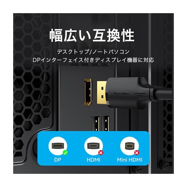 【DisplayPort 1.2】 最大解像度:16K / 最大リフレッシュレート(フルHD時):240Hz DisplayPortはデジタル式ディスプレイケーブルで、「DisplayPort 1.2」や「DisplayPort 1.4」といったバージョンが存在します。端子サイズの異なるMini DisplayPortもあるため、形状に注意しなければいけません。